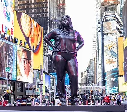 The visual culture of this shift is telling. In Times Square, New York City, a 12-foot bronze statue of a corpulent Black woman seated in a chair—entitled “Seated” by artist Vinnie Bagwell—was unveiled in 2022. The figure, presented as dignified and maternal, recalls the prehistoric Venus figurines and specifically the Seated Woman of Çatalhöyük. While not intentionally designed as such, the resemblance is archetypally powerful: a modern fertility goddess enthroned in the heart of the liberal West, representing emotional gravity, racial identity, and social dignity through sheer physical presence.